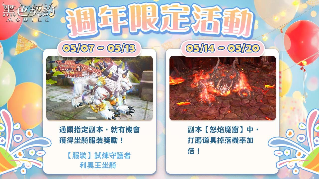 週年限定!特殊掉落活動好康大放送週年活動期間,《黑色契約MOBILE》將接連開啟兩檔「特殊掉落活動」:5 月 7 日至 5 月 13 日只要通關指定副本「地下惡魔巢穴」與「惡魔之塔」,就有機會掉落坐騎服裝「試煉守護者 利奧王坐騎」,甚至可能獲得時限永久的版本!銀白巨獅身軀加上霸氣外型,一出場絕對引起眾人目光!第二檔活動將於 5 月 14 日至 5 月 20 日開啟,「怒焰魔窟」副本中的打磨道具掉落率將提升至三倍!此外還加碼掉落打磨道具全系列,是玩家積攢材料、強化深淵裝備的絕佳時機。記得要把握週年活動的時間前往挑戰!