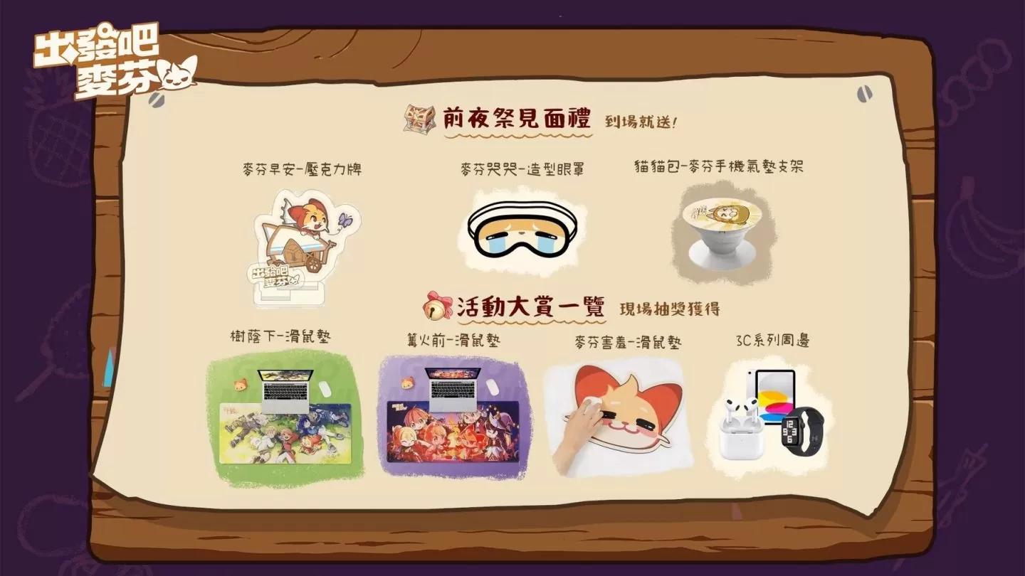 一起圍火團聚吧!《出發吧麥芬》半週年前夜祭見面會活動募集中等不及漫畫博覽會的冒險家們看這裡。為了好好犒賞辛苦的冒險家,官方將於 7/20(六)在松山文創園區多功能展演廳舉辦半週年前夜祭見面會,現場不但有美味的「營地創意 Buffet」,到場還可以獲得活動限量週邊「麥芬造型眼罩」、「貓貓包手機支架」、「露營車壓克力牌」,贏得旅團分組競賽及現場抽獎活動還有機會獲得高額遊戲虛寶、Ipad、Apple Watch 等 3C 週邊,本次活動採報名抽獎制,報名時間至 7/12(五)為止,想要報名的冒險家手速要快。
