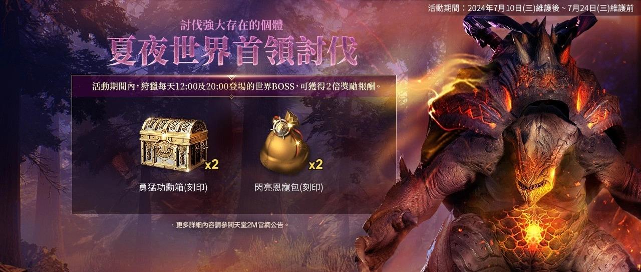 全伺服器「夏夜世界首領討伐」:7 月 10 日維護後到 7 月 24 日維護前,活動期間內,狩獵每天 12:00 及 20:00 登場的世界首領,可獲得 2 倍獎勵報酬。
