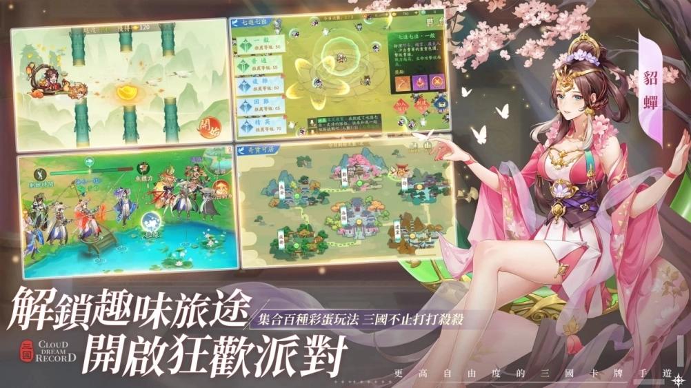 全明星陣容助陣,這個三國超熱鬧《三國雲夢錄》為了讓玩家在遊戲中更輕鬆上手,從上市日開始就有「實況主名將團」每日開台,從多角度為大家解說遊戲,在雲夢錄中創建同盟陪伴玩家。更有超多實況 PK 活動,助力各位玩家融入雲夢世界!本次也特別邀請台灣搖滾音樂創作者,三金(金馬獎、金曲獎、金鐘獎)大滿貫歌王「亂彈阿翔」,以雲夢首席樂師身份創作並演繹遊戲主題曲「不為誰而戰」,並與他的戰隊「固定客樂團」共同參與了 MV 演出,為玩家獻上精彩的視覺盛宴。同時也邀請了香港演藝界的粗口天王「林雪」飾演「董卓」一角並擔任遊戲首席福利顧問,為玩家送上 10,000 連抽福利,不肝不課抽心儀武將!社交養成更自由,奇趣彩蛋任探索在《三國雲夢錄》中玩家可以操作角色前往大地圖自由探索,在主城中和其他玩家任意社交。官方表示《三國雲夢錄》擁有類似 MMO 的社交操作體驗,即使你什麼都不做,也依然能感受到熱鬧的氛圍,從此告別單調的卡牌互動和單機體驗,讓交友不再受限!除了擁有豐富的社交玩法外,遊戲內更是有大量可探索三國場景。《三國雲夢錄》作為更高自由度的三國卡牌,為了貼心照顧到每一位玩家,官方表示遊戲加入了大量彩蛋奇遇玩法,豐富的彩蛋故事和彩蛋形象等待喜歡驚喜的玩家來探索。更有釣魚、種菜、生存等小遊戲為玩家帶來獨特的休閒卡牌體驗,充分滿足各類玩家的日常放鬆需求。