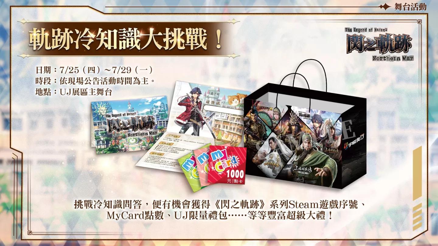 舞台活動「軌跡冷知識大挑戰」展期間宇峻奧汀展區主舞台將舉辦《軌跡》冷知識問答挑戰。參加者將有機會獲得《閃之軌跡》系列 Steam 遊戲序號、MyCard 點數、UJ 限量禮包......等等限量超值好禮!這是一次考驗你對《軌跡系列》了解程度的絕佳機會。快來挑戰看看你是否能全部答對,贏取豐厚獎品吧!