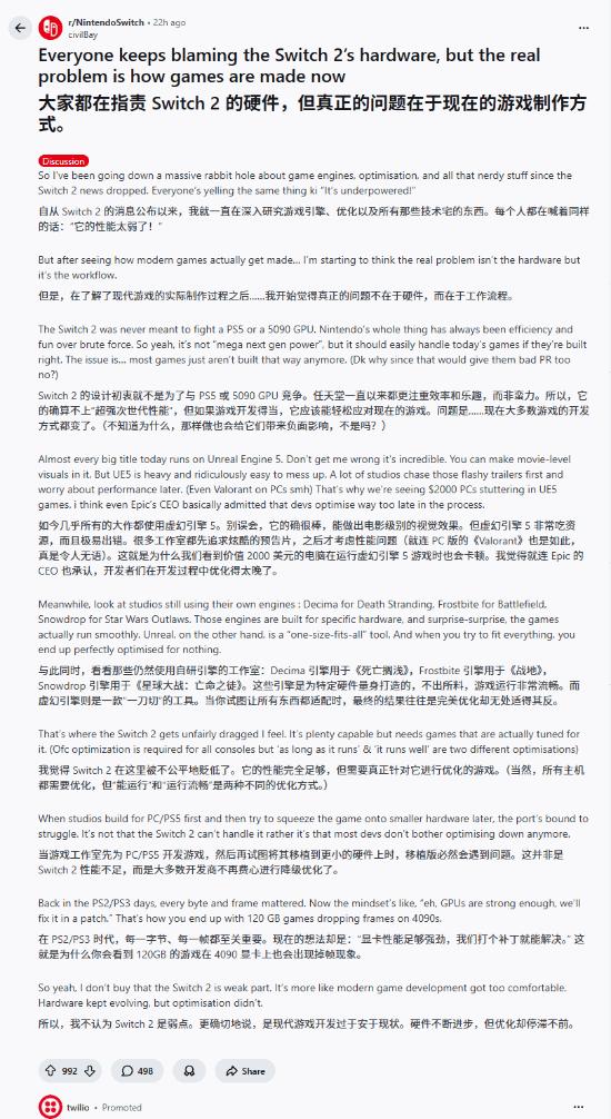 近日,Reddit论坛上一篇关于Switch2性能与游戏开发优化的讨论引发国外网友热议。