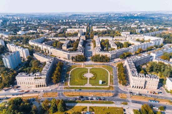 中央广场的建设始于 1949 年。按照最初的构想,它将成为“理想城市”的中心,由几条宽阔的林荫大道呈放射状延伸开来。广场位于从克拉科夫通往桑多梅日(Sandomierz)及更东方向的中世纪贸易路线上。