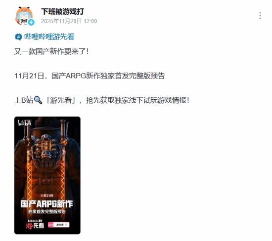 据B站游戏区官方账号“下班被游戏打”介绍,11月21日将有一款国产ARPG新作通过B站的“游先看”公布独家首发的完整版预告。