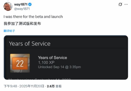 随后有玩家展示了自己的Steam资料页面的22年“老兵”徽章,引来大量网友围观。